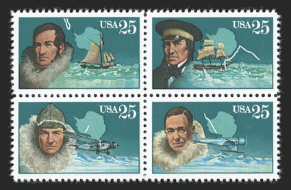 se-tenant error blocks have been reported 1990 PF certificate.#2389b, 25c Antarctic Explorers se-tenant block, engraved black omitted, exceptionally well centered and fresh example of this error, o.g., n.h., extremely fine; only twenty se-tenant error blocks have been reported; 1990 PF certificate. (Image) $1,250.00