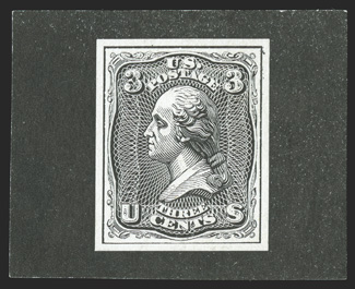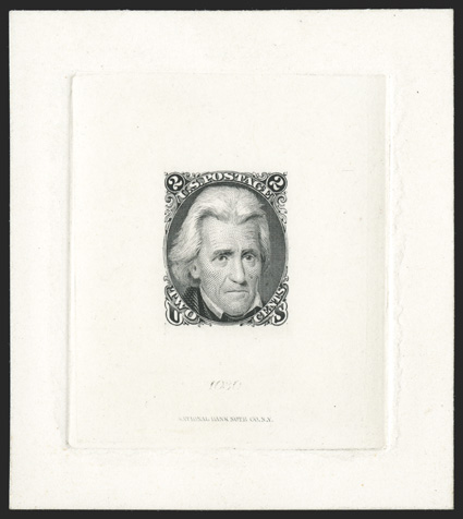 scarce.#73aP1, 2c Black, die II, large die proof on India, die sunk on 72x80mm card, with National Bank Note Co. imprint and "1030" at bottom, remarkably fresh, very fine and exceedingly scarce. (Image) $2,500.00