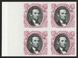 colors throughout, 129P3 block has trivial flaws, otherwise very fin#112P3-122P3, 1c-90c 1869 Pictorials, plate proofs on India cplt. in blocks of four, including both 15c types, several are sheet-margin blocks, four are mounted on card, bright colors throughout, #129P3 block has trivial flaws, otherwise very fine-extremely fine; an especially handsome set of blocks; 15c Type III with 1991 PF certificate, 24c with 1978 PF certificate, and 90c with 1991 PF certificate. (imagea) (Image) $5,460.00