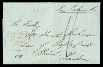 2004 c   1830-54 entire letters (3) and entires (6) showing a range of Colombo datestamps including 1830 (7 Oct.) Official entire showing Crown framed "colombo/post free", 1842 (24 Jan.) entire to London showing Crown framed "colombo/post paid" with reversed "s", 1843 (17 July) entire to London showing "post paid" straight-line h.s., 1843 (19 Sept.) and 1844 (2 July) entire letters to London showing Crown oval "colombo/post paid" (the former crossed by filing crease) and 1854 (15 May) entire to Kandy showing "colombo/post not paid" c.d.s. on reverse. Est. $400-500