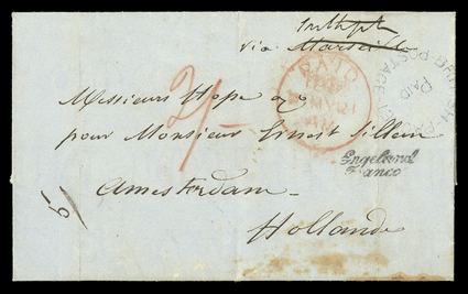 attractive.1862 (18 Jan.) entire letter to Marseilles, showing slightly over-inked "galle/post-not-paid" c.d.s., hand-struck "18" (decimes) and red Marseilles entry c.d.s. Neat and attractive. (Image) Est. $200-300