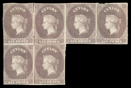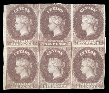 wrinkling.6d. purple-brown on unwatermarked paper, a rejoined block of six [109-111/121-123] from a strip of three, pair and a single, touched or cut-into at top and some minor wrinkling. (Image) Est. $200-300