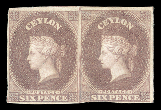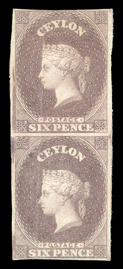 1, £12,000.6d. purple-brown with just clear to small margins, a little ragged in places, unused without gum, some very slight discoloration towards upper left, otherwise fine. Sc. 2; S.G. 1, £12,000. (Image) Est. $2,000-3,000