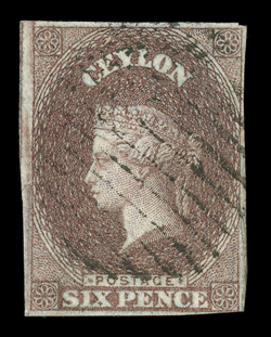 £450.6d. purple-brown, good to large margins, lightly cancelled by oval of bars; pressed vertical crease towards right, not affecting fine appearance. Sc. 2; S.G. 1, £450. (Image) Est. $200-300