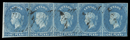 otherwise fine. A very scarce multiple. Sc. 3 S.G. 2.1d. deep turquoise-blue, a strip of five with mainly good to large margins (touched in two places), cancelled by oval of bars; pressed vertical crease between first two stamp, otherwise fine. A very scarce multiple. Sc. 3; S.G. 2. (Image) Est. $200-300
