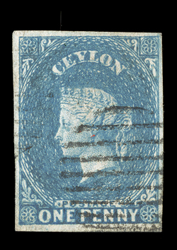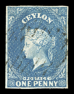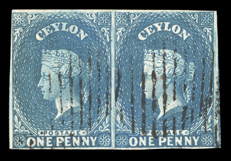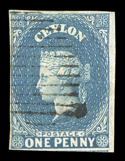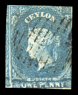 lovely deep color) and 1857-59 1d. blue (3), all cancelled by oval1857 (15 Oct.) envelope to Dublin, marked "Overland Route via Marseilles", bearing 6d. purple-brown (small to large margins showing portion of adjoining stamp at right and of lovely deep color) and 1857-59 1d. blue (3), all cancelled by oval of bars, showing red London Paid transit datestamp (14.11) alongside and, on reverse, "colombo/steamer letter" datestamp; the envelope pressed and with some repaired tears, and the stamps almost certainly lifted and replaced. R.P.S. Certificate (1974). Sc. 2, 3a; S.G. 1, 2a. (Image) Est. $1,500-2,000