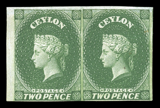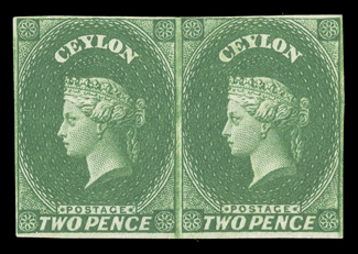 at lower left, the others with small to good margins. Good to fine. R.2d. green pairs (2) and singles (2) in slightly differing shades, all unused, one pair without gum, the others with large (pair) or small part original gum, one single touched at lower left, the others with small to good margins. Good to fine. R.P.S. Certificate (2002) for one pair. Sc. 4; S.G. 3, £1080+. (imagea) (imageb) (imagec) (Image) Est. $300-400