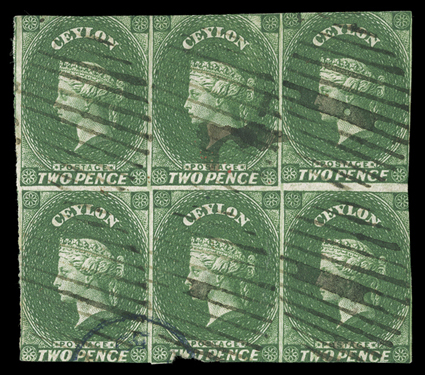 slightly breaks the surface on the center pair, a trifle wrinkled elsewh2d. green, a block of twelve with large part original gum, just touched at left center, otherwise good to large margins all round, the lower row with horizontal crease which slightly breaks the surface on the center pair, a trifle wrinkled elsewhere, nevertheless of good color and a very rare multiple. Sc. 4; S.G. 3.provenance: R.C. Agabeg, May 1982 (Image) Est. $5,000-7,500