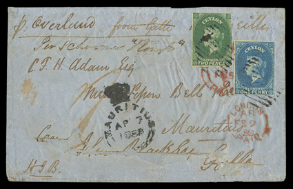 1d. deep turquoise-blue and 2d. green, both tied by oval of bars, showing1858 (Feb.) envelope from England to Mauritius via a forwarding agent at Galle, showing red Paid despatch and London Paid (9.2) datestamps, the former virtually obscured by 1d. deep turquoise-blue and 2d. green, both tied by oval of bars, showing Crowned "mauritius/g.p.o." arrival d.s. (7.4) and, on reverse, framed "forwarded by/john black/galle" and "galle/post paid" datestamp (15.3); the envelope with some ink-etching affecting the face panel. A rare item of transit mail. (Image) Est. $1,000-1,500