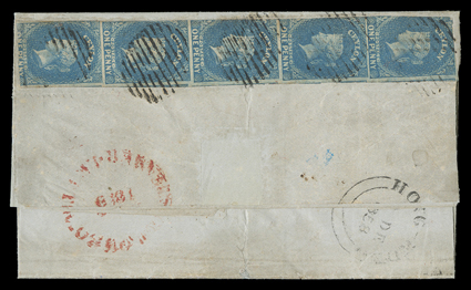 of bars and showing, across join, red colombosteamer letter a1858 (18 Nov.) entire letter from Colombo to Hong Kong bearing, on reverse, 1d. deep turquoise-blue vertical strip of five (touched or cut-into in places) clearly tied by oval of bars and showing, across join, red "colombo/steamer letter" and arrival (9.12) datestamps. (Image) Est. $2,000-3,000