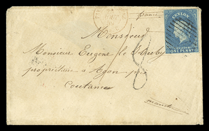 by oval of bars, showing manuscript 1, handstruck 8 (decimes du1859 (27 July) envelope from Galle to France, bearing 1d. deep turquoise-blue (good to large margins on three sides, touched at top) paying the inland rate to ship, cancelled by oval of bars, showing manuscript "1", handstruck "8" (decimes due) and, on reverse, "galle/steamer letter" c.d.s. in red with French T.P.O. datestamps; the envelope with part of flap missing and a fraction soiled. (Image) Est. $1,500-2,000