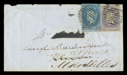 showing, on reverse, large part red despatch and Alexandria (7.2) dat1860 (Jan.) envelope from Colombo to Alexandria and re-addressed to Marseilles (addressee's name expunged), bearing 1d. blue and 1/- slate-violet, both tied by oval of bars and showing, on reverse, large part red despatch and Alexandria (7.2) datestamps; the envelope with large part of flap missing. B.P.A. Certificate (1995).provenance: Sotheby's auction, July 1995 (Image) Est. $1,500-2,000