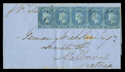 showing, on reverse, gallesteamer letter and arrival (6.7)1860 (8 June) entire letter ex "Germain Nicholson" correspondence from Galle to Melbourne, bearing 1d. deep turquoise-blue strip of five lightly cancelled by oval of bars and showing, on reverse, "galle/steamer letter" and arrival (6.7) datestamps in red; the face panel with age stain below strip otherwise fine. A rare make-up of the 5d. rate to Australia. R.P.S. Certificate (1999). (Image) Est. $4,000-5,000