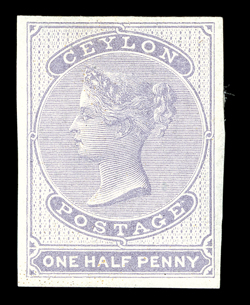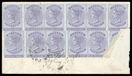 datestamp alongside, and 1862 (27 May) envelope from Pusilawe to Ir1859 (28 Feb.) restored entire to Galle, bearing imperforate reddish lilac (2) on blued, both cancelled by diagonal manuscript ink strokes and showing red "galle/post-paid" datestamp alongside, and 1862 (27 May) envelope from Pusilawe to Ireland bearing, on reverse, imperforate reddish lilac on blued block of twelve (6x2; the lower right stamp and part of the two adjacent stamps torn away through opening), all cancelled by light oval of bars and tied by circular "pusilawe/post" with manuscript date and "Paid" inserted, and "h&k/pact" transit datestamp. R.P.S. Certificate (2001) for former. (Image) Est. $1,000-1,500
