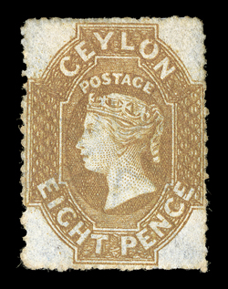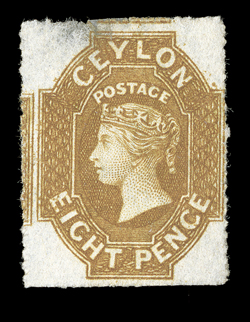 £800+.Rough perf. 14 to 15½, 9d. deep brown block of eight (4x2) with sheet margin at top, unused with large part original gum, fresh and fine. Sc. 32; S.G. 33, £800+. (Image) Est. $3,000-4,000