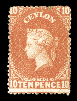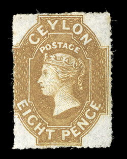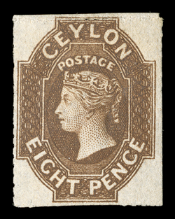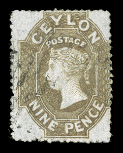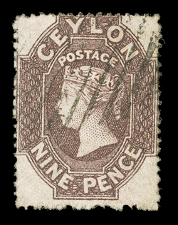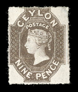showing red London Paid c.d.s. (15.12) with, on reverse, red 1859 (Nov.) entire ex "Gordon" correspondence from Kandy to London, marked "Via Marseilles", bearing 9d. purple-brown with small to large margins, cancelled by oval of bars, showing red London Paid c.d.s. (15.12) with, on reverse, red "kandy/post-paid" and "kandy/steamer letter" datestamps; some vertical filing folds, one close to adhesive. R.P.S. Certificate (1989). (Image) Est. $3,000-4,000