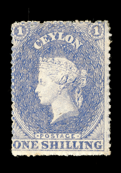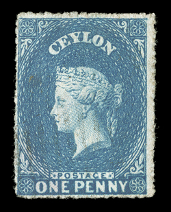 touched at right, strong color, tied by oval of bars and showing,1860 (16 Jan.) double rate entire letter from Colombo to London, marked "Per Overland Mail via Marseilles", bearing 1/- slate-violet with small to large margins on three sides, touched at right, strong color, tied by oval of bars and showing, on reverse, red despatch and arrival (18.2) datestamps; the face panel with some ink off-setting which affects the adhesive. (Image) Est. $2,000-3,000