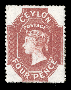 bars and showing, on reverse, kandypost-paid in red, k1860 (14 Feb.) 1d. stationery envelope from Kandy to London, marked "Marseilles" and uprated with two cut-to-shape 4d. dull rose of lovely deep color, clearly tied by oval of bars and showing, on reverse, "kandy/post-paid" in red, "kandy/steamer letter" and London arrival (17.3) datestamps. A unique franking on postal stationery. Holcombe Certificate (1984). (Image) Est. $40,000-50,000