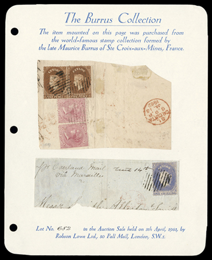 over-lapping and cancelled by neat oval of bars and showing, on revers1860 (3 Aug.) entire from Colombo to London, marked "Via Marseilles", bearing 1d. blue, 2d. yellowish green and 6d. purple-brown, all with margins in places, each slightly over-lapping and cancelled by neat oval of bars and showing, on reverse, despatch datestamp in red; the entire with lower flap missing. A neat and attractive three-color franking. R.P.S. Certificate (1983). (Image) Est. $1,000-1,500