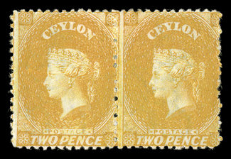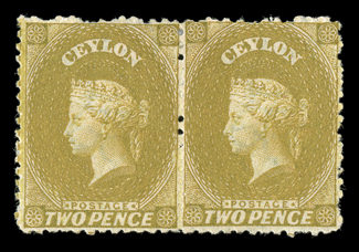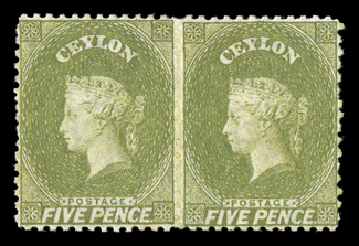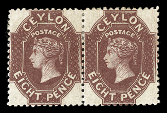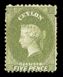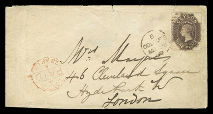 reverse envelope with traces of foxing though not unattractive. R.1869 (2 Apr.) envelope from Colombo "via Southampton" to Weymouth, bearing 9d. bistre-brown (a deep shade) placed sideways and cancelled with duplex, arrival c.d.s. (22.5) on reverse; envelope with traces of foxing though not unattractive. R.P.S. Certificate (2002). Sc. 55b; S.G. 69. provenance:"Serendib", February 2002 (Image) Est. $200-300