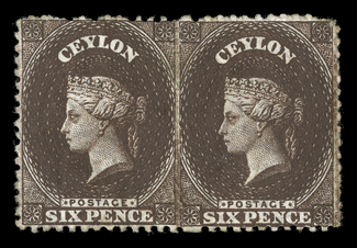 cancelled with two pen strokes and ovals of bars, Colombo Paid c.d.s.1869 (12 Jan.) entire letter from Colombo "via Southampton" to Scotland, bearing 6d. blackish brown in combination with 1866-68 1d. blue wing-margin strip of three, lightly cancelled with two pen strokes and ovals of bars, Colombo Paid c.d.s. at lower left, Forres arrival c.d.s. (15.2) on reverse; a few faults in places with filing crease crossing one of the 1d. values, though an unusual franking of the 9d. rate. R.P.S. Certificate (2007). Sc. 53e, 61; S.G. 61, 67a. (Image) Est. $200-300