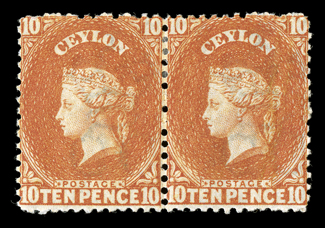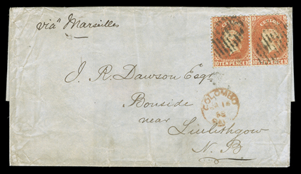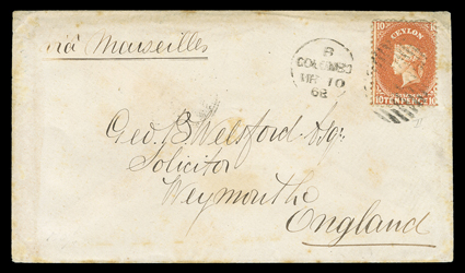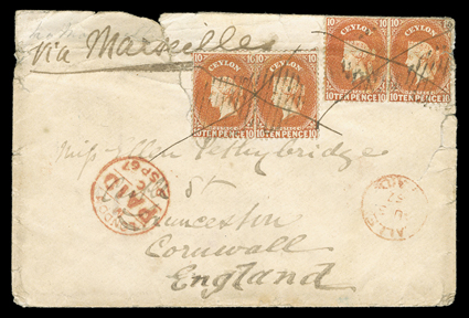 Mar.) double rate envelope from Colombo to Weymouth bearing 10d. orange pa1867 (3 Aug.) quadruple rate envelope from Galle to Cornwall bearing 10d. orange pairs (2), 1868 (16 Jan.) entire from Colombo to Scotland bearing 10d. orange and 1868 (10 Mar.) double rate envelope from Colombo to Weymouth bearing 10d. orange pair, all marked "via Marseilles" and cancelled with oval of bars with c.d.s. alongside; the quadruple rate cover with some faults though an unusual trio of 10d. rate covers. Sc. 56b; S.G. 70c. (imagea) (imageb) (Image) Est. $500-750