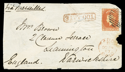 second (faults) from Kandy bearing 10d. deep orange cancelled with1867 (8 Aug.) and (14 Oct.) envelopes ex the same correspondence to Leamington, both marked "via Marseilles", the first bearing 10d. orange cancelled with Colombo duplex, the second (faults) from Kandy bearing 10d. deep orange cancelled with oval of bars and showing Kandy paid c.d.s. and framed "too late", both in red, both with Galle Paid and arrival c.d.s. on reverse. Sc. 56b; S.G. 70. (imagea) (Image) Est. $400-500