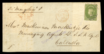 2157 c   1868 (31 Dec.) large part entire from Galle Per Mongolia S to Calcutta, bearing 5d. yellow-olive lightly cancelled B in oval of bars and with Galle Paid c.d.s. alongside, and
