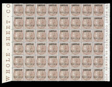 Sheet Con part imprint at left and Sheet Containing 80 Stamps aS.G. #54/80, O20/32, 1870-78 ½a-8a Victoria, overprinted "CANCELLED", a truly amazing "set" of fourteen different cross-pane blocks of 48 from the center of the sheet, with "Whole Sheet Con" part imprint at left and "Sheet Containing 80 Stamps" and values part imprints at right, comprised of nine postage value with 1865 ½a Blue, die I (#54), 8p Purple (#56), 1a Pale brown (#58), 2a Orange (#62), 4a Green (#64), 8a Carmine, die I (#65), 1866 6a8p Slate (#72), 1874 9p Bright mauve (#77), 1877 6a Olive-bister (#90), and five Service values with 1867 ½a Blue, die I (#O20), 1a Brown (#O23), 2a Orange (#O27), 4a Green, die I (#O29) and 1874 1a Brown (#O32), all incredibly fresh, generally well centered, o.g., never hinged, except #O29 rejoined at top two rows with hinges on eight stamps, two #56 damaged, one #64 thinned and two with selvage faults, otherwise fine-very fine.A visually stunning and unique group of these De La Rue color standards of which only a single sheet of 80 of each was produced. Described in "Specimen Stamps of British India" by Marcus Samuel. (imagea) (imageb) (Image) Est. $5,000-7,500