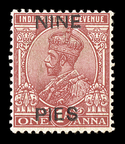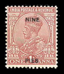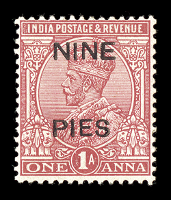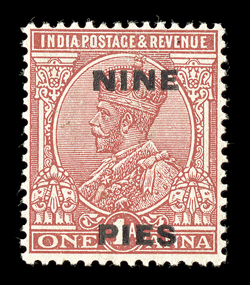 n.h., one stamp in pair and two in block with stained perfs., otherS.G. #192E, 1921 "Nine/Pies" essay surcharges on 1a Rose-carmine, singles of the five different essay surcharges, plus a pair of one and a block of four of another, o.g., l.h. or n.h., one stamp in pair and two in block with stained perfs., otherwise fine-very fine. (Image) Est. $200-300