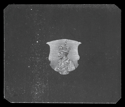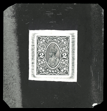 for the 1R value, and third 59x61mm of finished design for the 2a value,1925 2a George V Delhi essays die proofs, three different in black and white on art paper, first 60x52mm of unframed vignette, second 48x44mm of framed vignette, these being for the 1R value, and third 59x61mm of finished design for the 2a value, some corner mounting thins, otherwise very fine and unique; the finished specimens were printed in Delhi for circulation amongst the members of the Central Legislative Assembly to show what could be produced in India, and a year later India began printing her own stamps, these unique proofs represent an important transition from Indian stamps printed in London by De La Rue & Co. to those printed by the Security Printing Press at Nasik. (imagea) (imageb) (Image) Est. $1,000-1,500