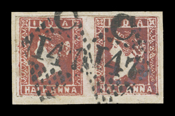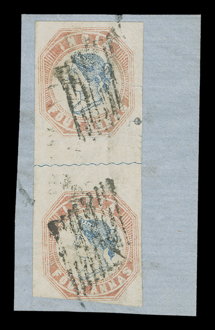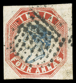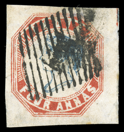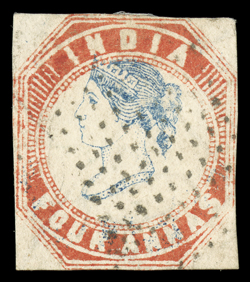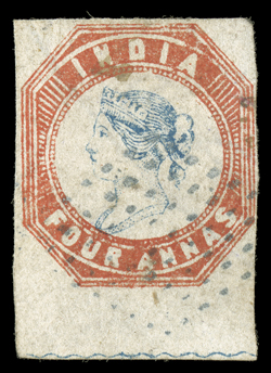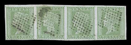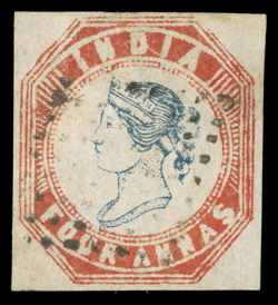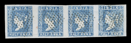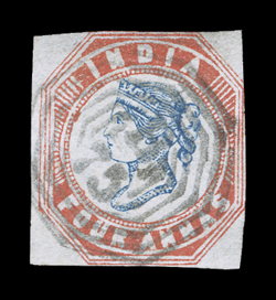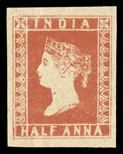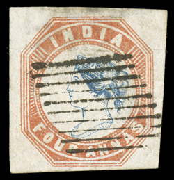 3159 Oog   India 1854-55 Lithographed issues large and valuable accumulation of hundreds of mostly used and some mint stamps, as well as a few covers, to give an idea of the scope of this holding we counted the 4a value and found 45 examples cut square, 130 examples cut to shape, four pairs, three of which are tied to piece, with eight items being accompanied by certificates and nearly all types represented, the ½, 1a and 2a values are as numerous if not more so, including mint and used singles, pairs, multiples and a few covers, there are many better cancels to be found throughout, including colored and used abroad, as well as some varieties and a few forgeries, mixed condition ranging from repaired to extremely fine so a careful viewing is essential. (imagea) (imageb) (imagec) (imaged) (imagee) Est. $7,500-10,000
