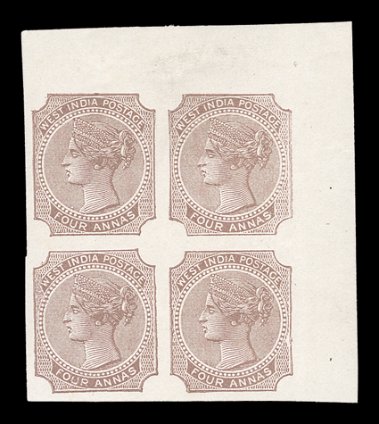 3157 Ebl   India 1866 West India Company 4a essay hoard of several hundred nearly all in multiples ranging from pairs to large blocks, comprised of brown (5), blue (4), rose (100) including a block of 60, and brownish-carmine (110) including blocks of 28 and 35, the latter showing cancellation removal trials, some creases and other faults, majority fine-very fine. (imagea) (imageb) (imagec) (imaged) Est. $500-750