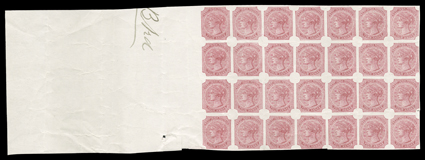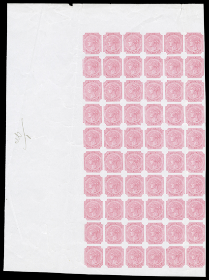 3156 EP   India 1854 issue essays, proofs and reprints substantial accumulation of over 100 items comprised of the ½a, 1a, 2a, 4a and 8a values in singles, blocks, multiples and even complete sheets, largely reprints with ½a Lion and Palm Tree types, ½a issued design in red sheet, less the bottom row, overprinted "Specimen" on reverse, ½a essay with crosses in upper corners block of 24 overprinted "Specimen", ½a and 1a Captain Thullier reprint sheets, and six 4a sheets of twelve and a sheet of 24, also 1890 photozincographed "Drawer No. 20 T" sheet showing various values, a few faults, most fine-very fine; a large and desirable holding. Est. $1,500-2,000