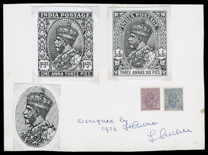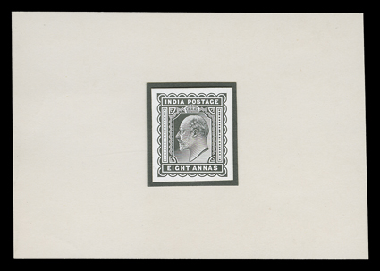 3158 P   India proofs and essays assortment, fifteen items including 1876 6a die proof, KEVII 4a black plate proofs in pair and block of four and 8a die proof, George V 3p and ½a die proofs, plus 1a3p and 3a6p essays and 1a "Service" overprint plate proofs (9), mostly fine-very fine. (imagea) (imageb) Est. $300-400