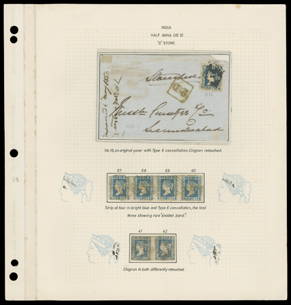 3161 Oc SG 8/10 S.G. #8/10, 1854 ½a Blue, die III specialized study, an interesting old time collection comprised of 161 used singles, seven pairs, strips of three and four and three covers, all mounted and meticulously annotated on quadrille pages, includes studies of D stone characteristics with identifying features of the different positions on the plate, often with detailed illustrations, cancellation studies, shade studies, etc., typical mixed condition, however much is fine-very fine; an excellent lot for the specialist. (imagea) Est. $4,000-5,000