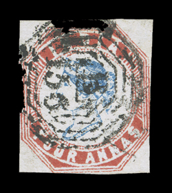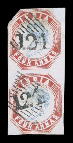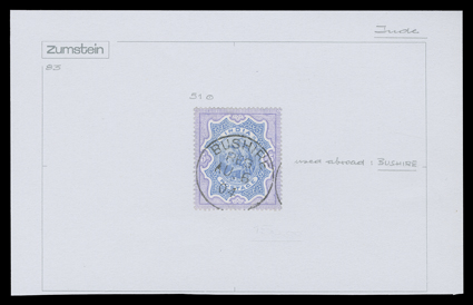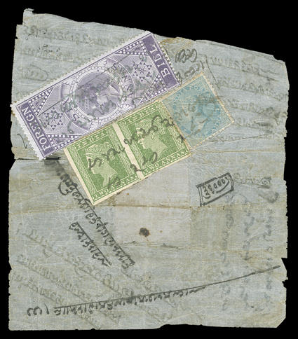 used in late 1856 and 1857 after Great Britain declared war on PersiaField Force/Persia, 5 August 1857 split circle datestamp with manuscript "4as" rate on native cover to Bombay, Bombay arrival backstamp, very fine and scarce; this postmark was used in late 1856 and 1857 after Great Britain declared war on Persia in November, 1856 because her treaty obligations had been violated by the occupation of Herat on the Afghan border, operations began in the Gulf by occupying the island of Karak and then disembarking an Indian Expeditionary Force near Bushire, the Persians sued for peace when Bushire fell, however owing to poor communications subsequent operations were carried out in ignorance of this. (Image) Est. $500-750