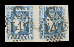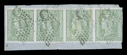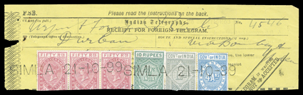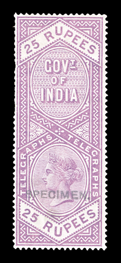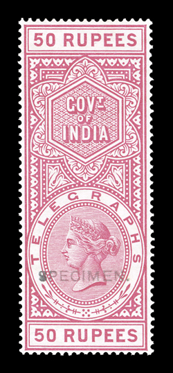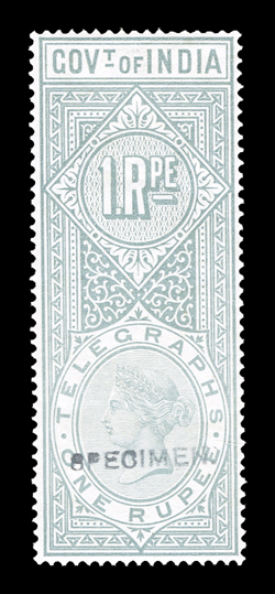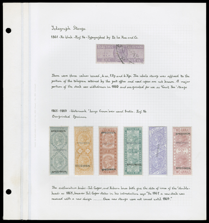 3172 ogOS   Telegraph stamp collection of over 130 items mounted and written-up on quadrille pages, the issues from 1861 to 1905 are represented, including overprints and surcharges, mostly used, but also some mint, a set of six values of the 1865 issue between 2a and 14R6a overprinted "Specimen" and one on telegraph form, with values to 50R noted, some small faults, most fine-very fine. (imagea) Est. $200-300