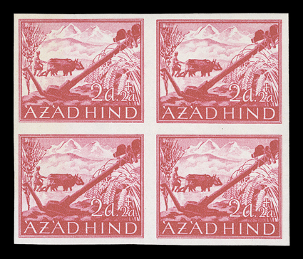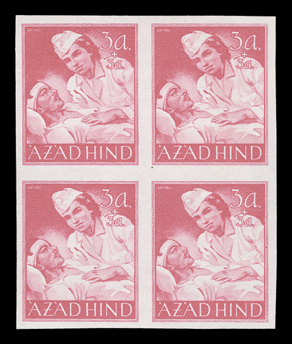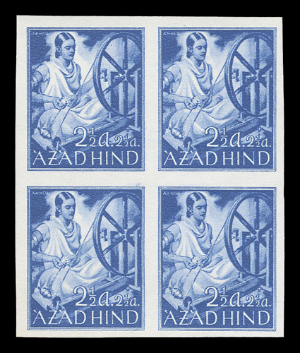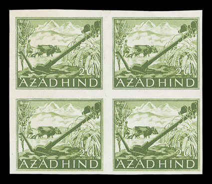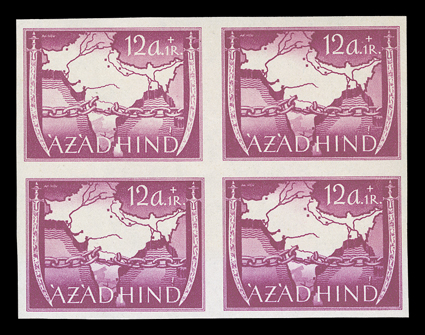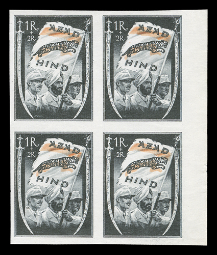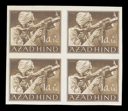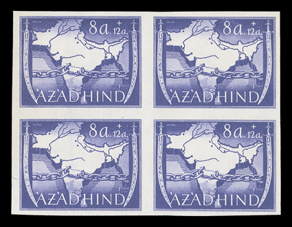 3167 og/nh   Azad Hind stamp stock, a sizeable stock of these stamps, which were prepared in Berlin in 1943 for the Provisional Government, includes singles, sets, blocks of four and multiples of both the regular issue and semi-postal values, includes nine examples of the 1R and 2R orange and black imperforate, largely in complete sets, o.g., l.h., h.r. or n.h., fine-very fine. (imagea) (imageb) (imagec) (imaged) (imagee) (imagef) (imageg) (imageh) Est. $300-400