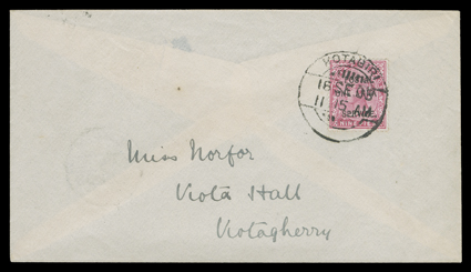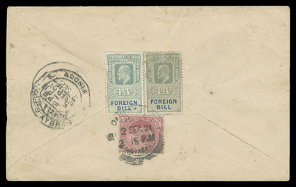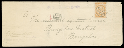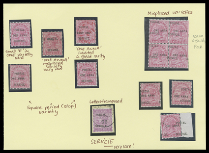 3168 ogObl   "Postal Service" overprint accumulation of several hundred mint and used singles, sets and blocks of Victoria and Edward VII, including surcharges, several errors or varieties and a nice range of postmarks among the used, plus two usages on covers accepted as postage, some faults, mostly fine-very fine; these stamps were for the exclusive use of the post office for the indication of the customs duty to be collected on foreign inbound parcels brought to India by mail steamers; one accompanied by BPA certificate. (imagea) (imageb) (imagec) Est. $500-750