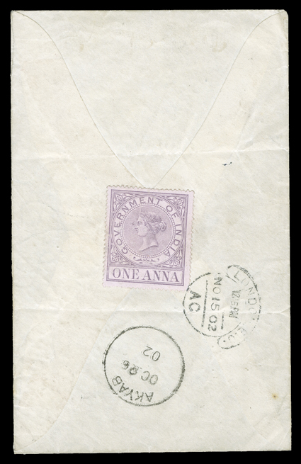 directive, magenta boxed LoodianaPaid transit backstamp, red ovalFirst Afghan War, folded letter datelined "Jallalabad Fortress, in Afghansitan, 20th September, 1842" to England endorsed "Pt. Pd. to Bombay" and with "pr Steamer via Falmouth" directive, magenta boxed "Loodiana/Paid" transit backstamp, red oval "India" handstamp, red London transit and ms. "1/-" collect rate, very fine.Interesting long letter about the war including ...Our Army which is at Cabool is eleven day march from this - they went over the ground where the massacre took place in December last, at a place called Jugdulluk. The road for miles is as thickly covered with bones & bodies of men & camels, every man's head had been severed from his body - we buried more than 1000 of these remains - there was one stockade across the road composed entirely of skulls....The expense of the 4 years has almost ruined India - whether England will have to pay a proportion we know not - it was Russia that caused the whole..." The writer blames Russia for the war and British intervention, but the British experience did not stop the Russians 150 years later (nor the Americans now), which eventually led to the breakup of the Soviet Union. (Image) Est. $200-300