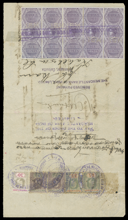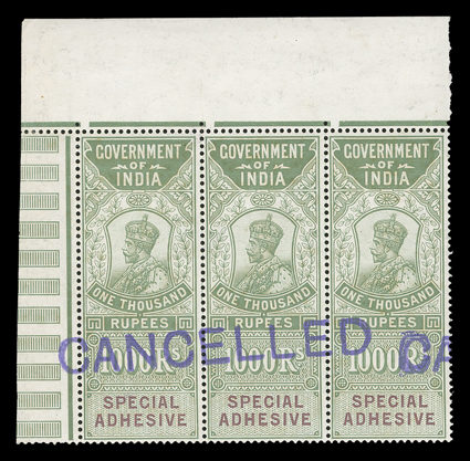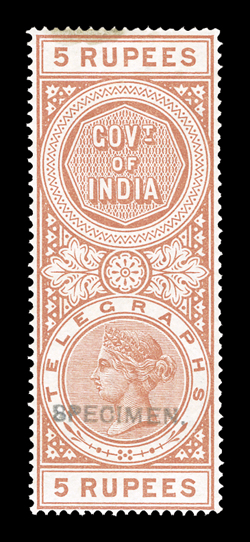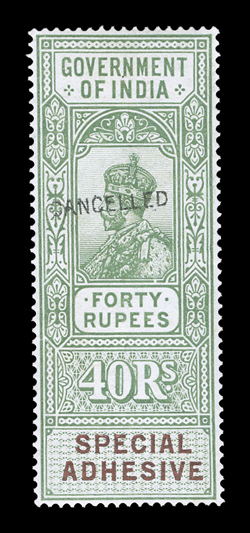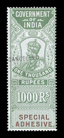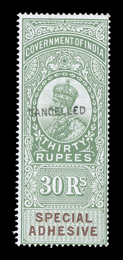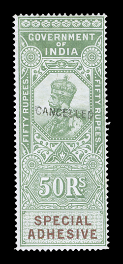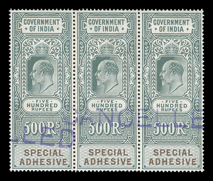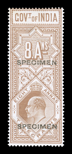 3169 S   British India Queen Victoria revenues overprinted "Specimen" or "Cancelled" substantial accumulation of hundreds of perf. and imperf singles, sets and multiples from a large range of offices including Court Fee, Customs, Foreign Bill, High Court, Receipt, Share Transfer and Small Cause, also some revenue stamped paper and reprinted die proofs of various revenue heads and some watermarked paper, a few faults, most o.g., n.h. or without gum as produced, fine-very fine; all ex-De La Rue Archives. Est. $1,000-1,500