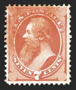 certificate.#138, 7c Vermilion with grill, unused, with traces of o.g., well centered within large margins, deep intense color and impression, choice very fine; 1989 PF certificate. (Image) $1,650.00