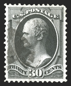 crease, still choice very fine clear 1988 PF certificate and a 2010 PSE#143, 30c Black with grill, well centered and exceptionally fresh, with strong color and an excellent impression, lightly cancelled, current certificate notes a small corner crease, still choice very fine; clear 1988 PF certificate and a 2010 PSE certificate (VF-XF 85; SMQ $4,900.00). (Image) $4,000.00