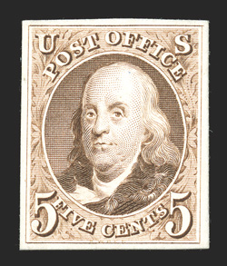 PF certificates.#1b, 5c Orange brown, full even margins all around, especially rich color and a well inicised impression, red grid cancel, a very fine example of this scarce shade; 1981 and 2008 PF certificates. (Image) $1,100.00