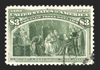 impression, cancelled by a light purple postmark, extremely fine#243a, $3.00 Columbian, the olive green shade, a highly select used example that is extraordinarily well centered amid large margins, deep luxuriant color and a crisp detailed impression, cancelled by a light purple postmark, extremely fine; an especially handsome used Three Dollar Columbian; 2008 PF certificate. (Image) $950.00
