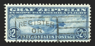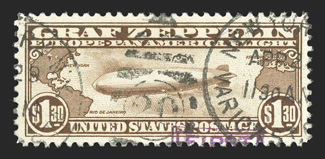 Friedrichshafen backstamp, very fine.#C14, $1.30 Graf Zeppelin, tied by "Lakehurst, N.J./May 10, 1930" waving flag machine cancel to flown cover with violet U.S. and red German flight cachets as well as a Friedrichshafen backstamp, very fine. (Image) $400.00