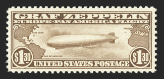 983 nh C14 C14, $1.30 Graf Zeppelin, well centered within large margins, rich color, pristine o.g., n.h., choice very fine 2006 PF certificate.#C14, $1.30 Graf Zeppelin, well centered within large margins, rich color, pristine o.g., n.h., choice very fine; 2006 PF certificate. (Image) $800.00