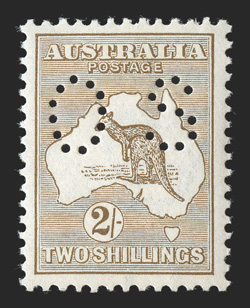 (S.G. 036 for hinged £1,100 ACSC 36ba).#OB43, 1915 2/- Brown, small perforated "OS", an exceedingly choice example of this scarce stamp, well centered, fresh color, o.g., n.h., extremely fine; 2010 Ceremuga certificate (S.G. #036; for hinged £1,100; ACSC #36ba). (Image) for hinged $625.00