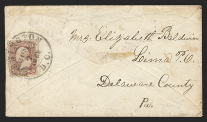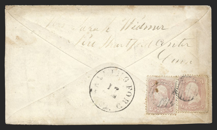 the generals initials, very fine 2008 PF certificate.#65, 3c Rose, single tied by Washington c.d.s. on cover from General Fitzjohn Porter to his wife in New York, with rare "Headqr's Army of the Potomac" c.d.s. at bottom left, with the general's initials, very fine; 2008 PF certificate. (Image) Est. $500-750